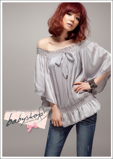 YE 0228 (60065)柔光丝绸一字领蝴蝶袖上衣 (白色)/ (灰色)